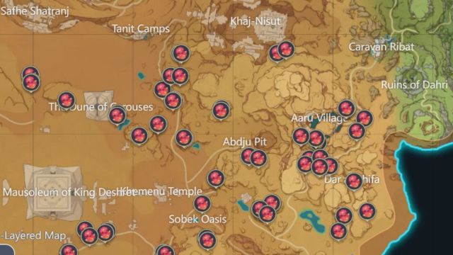 Ягоды хны в Genshin Impact встречаются в пустынной местности региона Сумеру. Эти ягоды выделяются среди скучной бежевой пустыни.